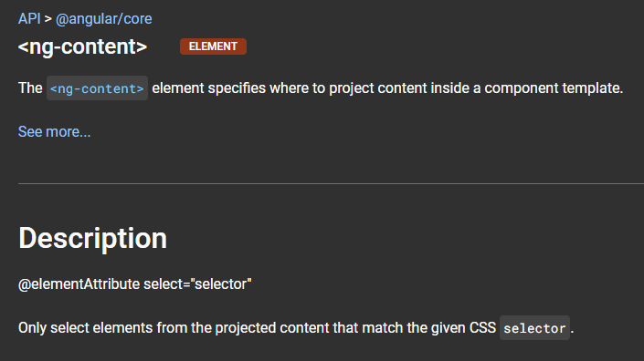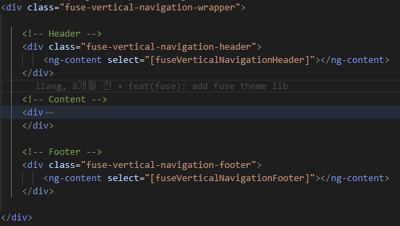 fuse-vertical-navigation 컴포넌트 안에 있는 ng-container 속성값 "fuse-"는 라벨이라고 볼 수 있다. 그리고 ng-content는 select에 그 라벨을 넣어줌으로써 ng-content는 ng-container 안에 들어갈 수 있게 된다.